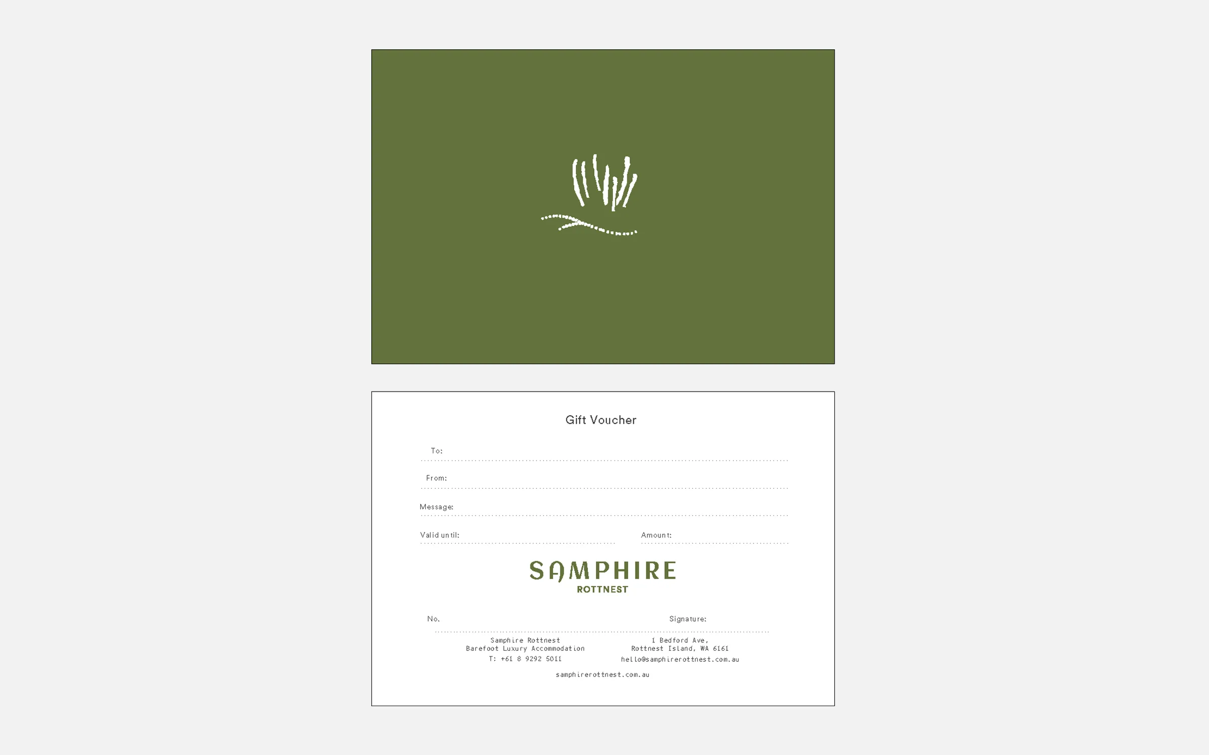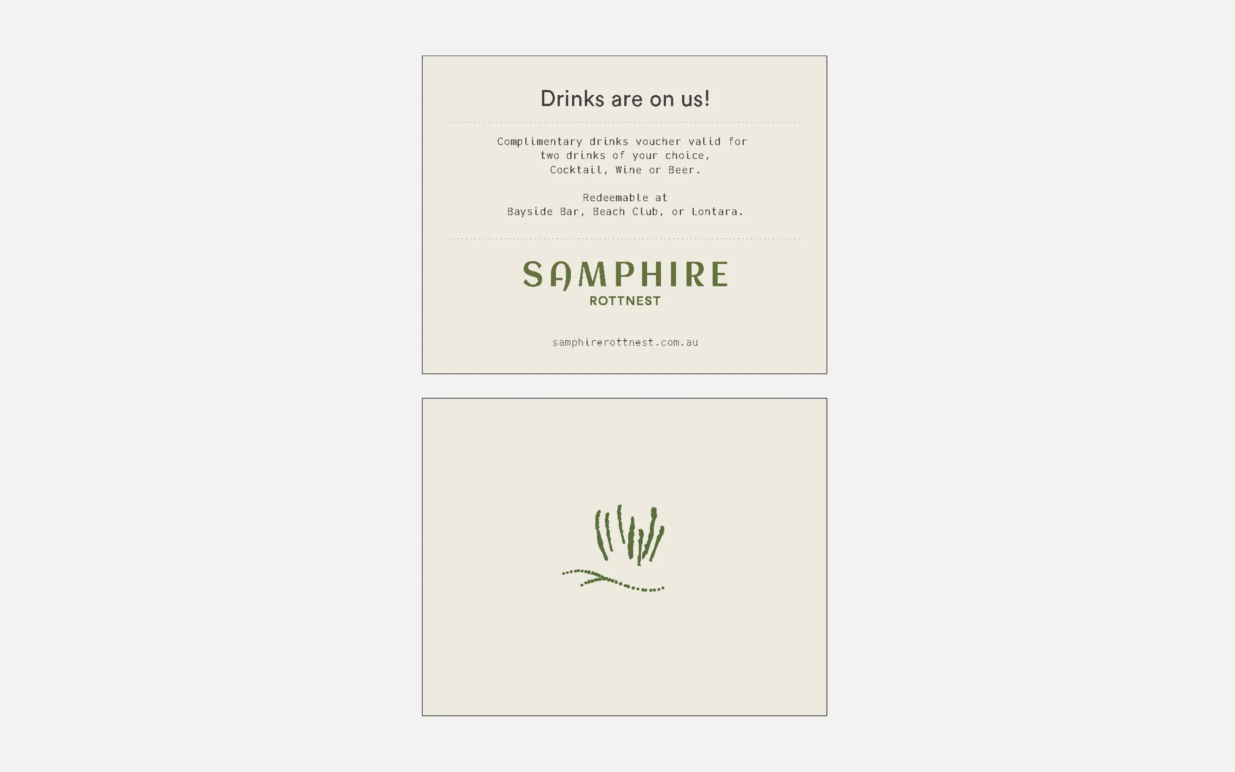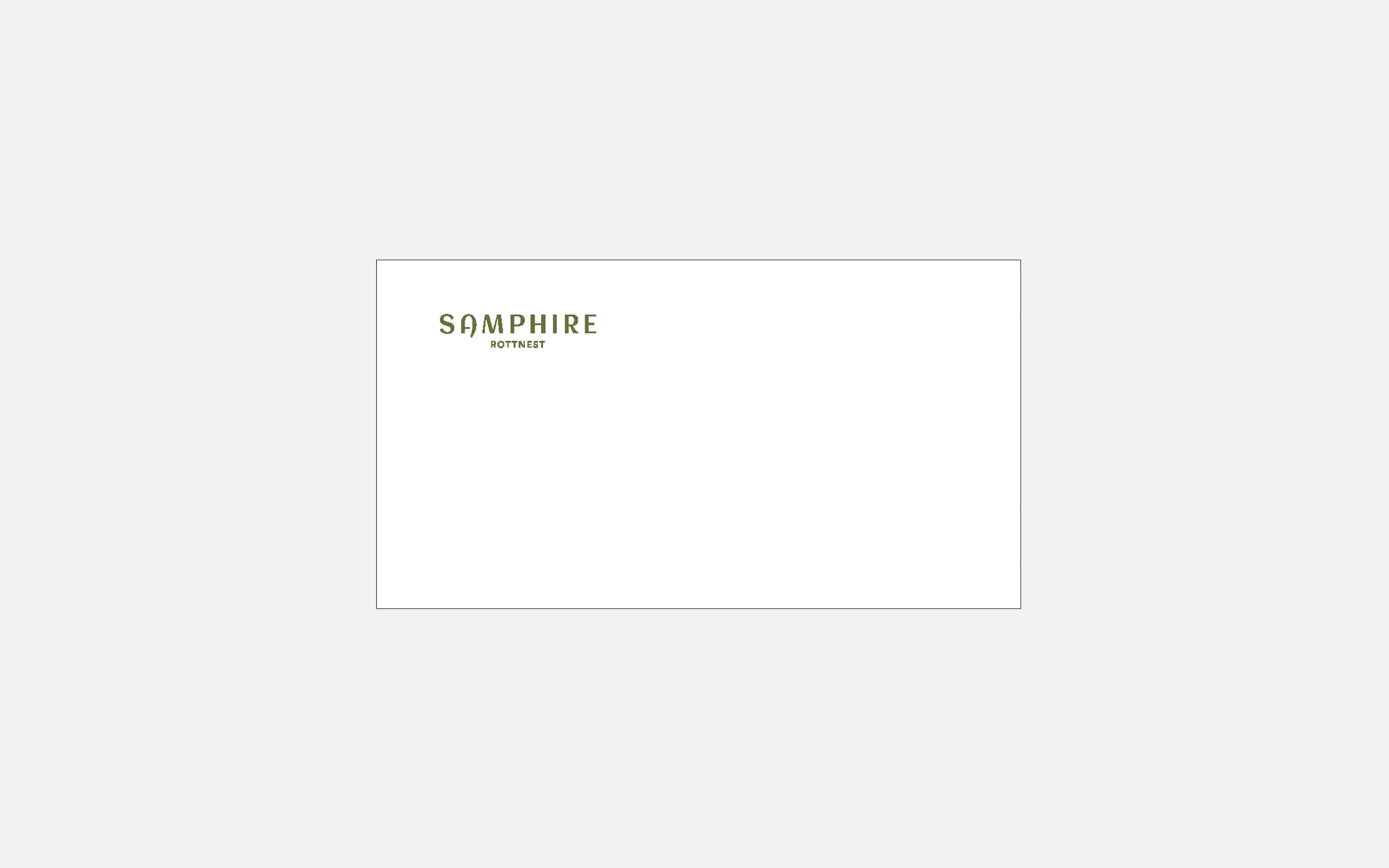 This is the official Masterbrand for Samphire Rottnest. The arrangement of the typography combines as a unit to form the Masterbrand.