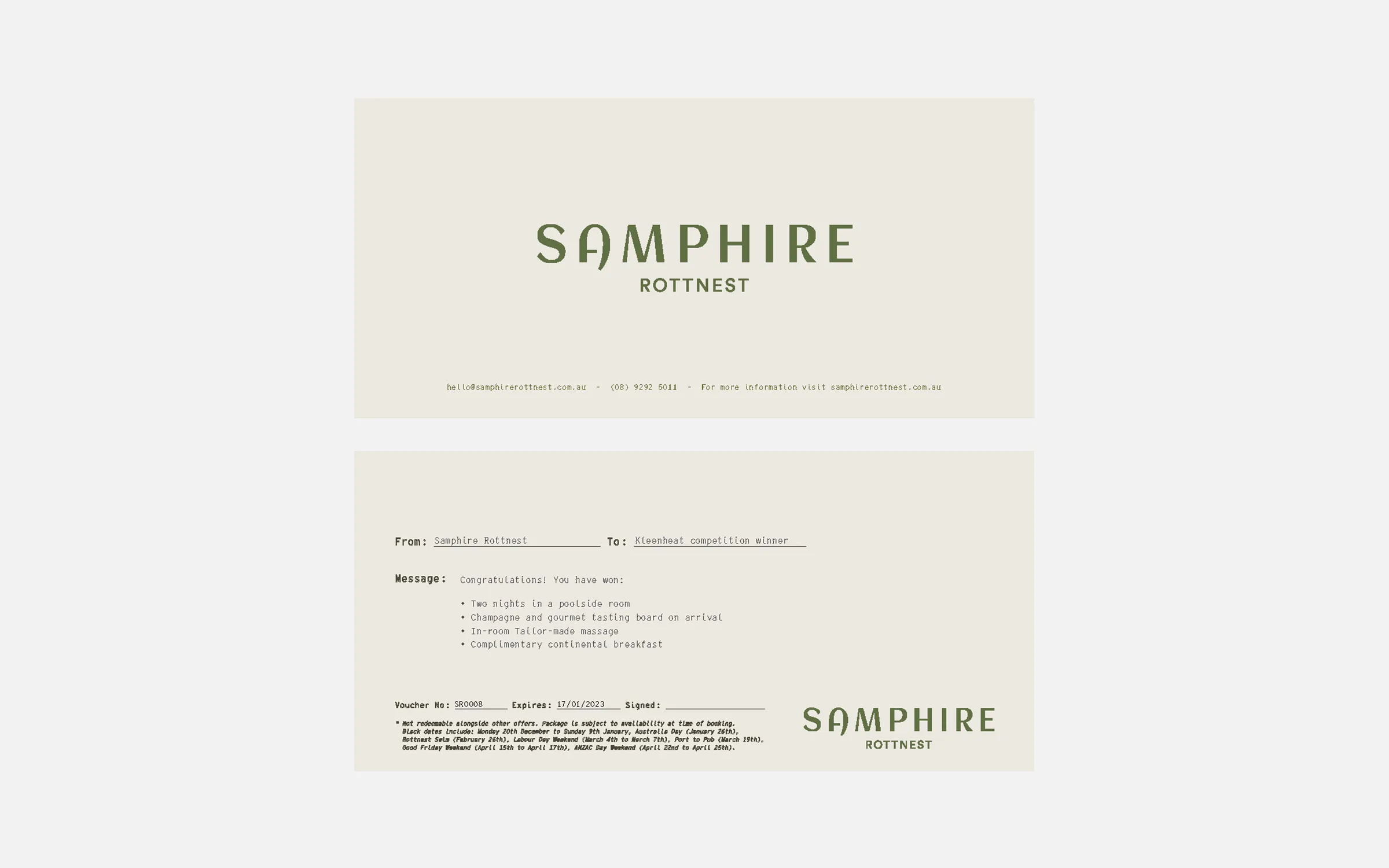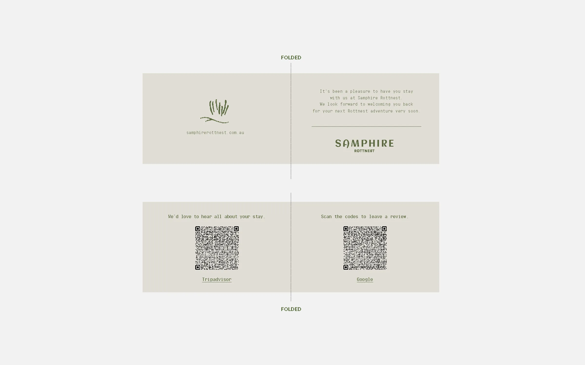 It should reflect the experience guests have at Samphire Rottnest and on the island in general. Think sunny, relaxed, carefree. Print communications should have personality and not be overly polished.All copy should be inclusive rather than exclusive, and approachable rather than pretentious.